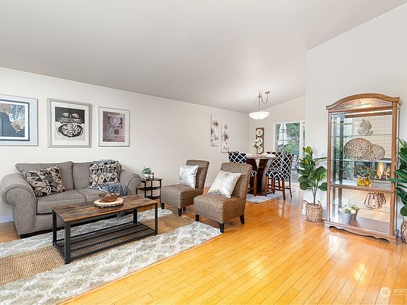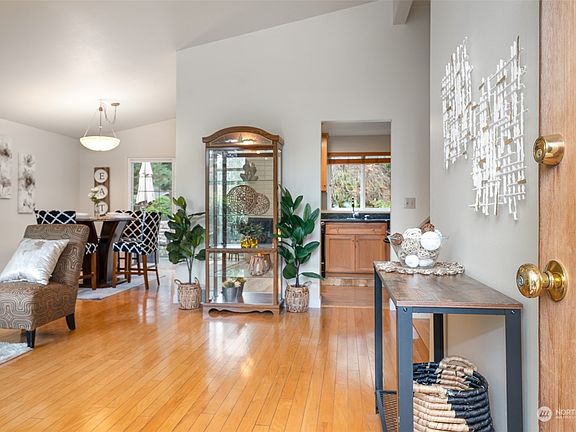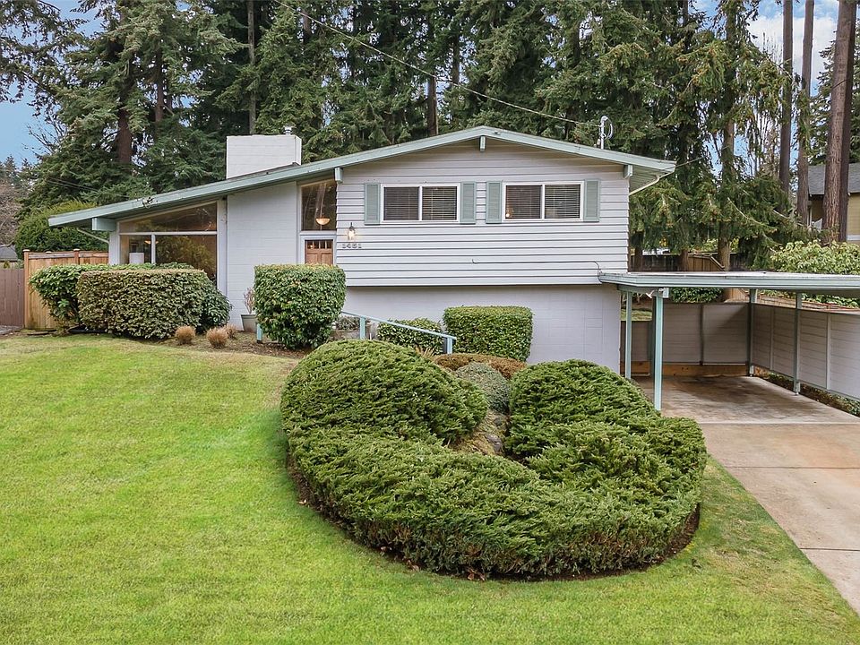 Perfect mid-century modern tri-level home in NE Bellevue on an 11,465 sq. ft. lot! This 4 bedroom, 1.75 bathroom home offers everything you need for comfortable and convenient living. Walk into the open concept living and dining area with hardwood floors, and a cozy floor-to-ceiling brick fireplace.  The kitchen features Alder Shaker cabinets and granite countertops. Enjoy the view of the large park-like backyard that's perfect for entertaining! Don't need the 4th bedroom? Use it as a recreation room, office, gym or studio!  The fenced backyard, with two large patios, a storage shed, and beautiful Northwest native landscaping, gives you plenty of outdoor living space to enjoy. Conveniently located near schools, shopping, parks, and more.