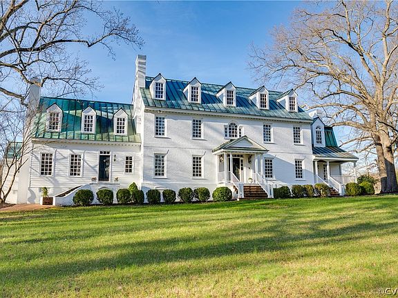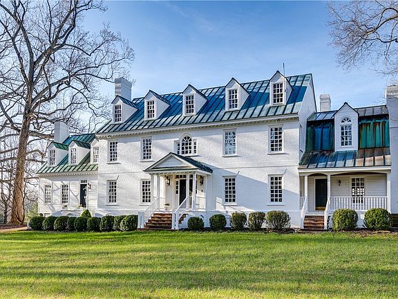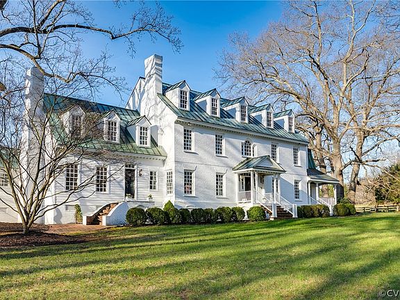 Spectacular Federal-style manor home is perched on a lovely knoll overlooking 34.33 rolling acres in the beautiful Manakin Sabot hunt country! This 5 bedroom 4 1/2 bath custom home is only 34 years young, but it evokes an earlier period with its lovely millwork, high ceilings, and gracious oversized rooms. As you wind down the long driveway, the freshly painted brick exterior and unique patinaed copper roof welcome you home. A side entrance is reminiscent of colonial Williamsburg with its curved staircase and wood siding. In front the two-story main entrance opens to marble flooring, a wrap-around staircase, and a sparkling crystal chandelier. A formal living room with one of the ten fireplaces in the home flows beautifully to the pretty side foyer with its exposed brick and second staircase. Beyond this is an elegant formal dining room with yet another fireplace. The open kitchen and breakfast room have fabulous views of the back acreage. Through the kitchen is the rear foyer with another staircase and a hallway to the less formal rooms: a bright sunroom with bay windows and built-in bookshelves, a cozy family room with stone fireplace, and a traditional library with its own fireplace. Upstairs, the fabulous primary bedroom is bright and sunny with a sitting area, fireplace, exterior balcony, huge marble bath (with fireplace!), dressing room, and two walk-in closets. There are four additional bedrooms (two with fireplaces) and two full baths, plus a terrific walk-up attic that could be finished if needed. The acreage is a mix of farmland (hay), rolling hills, and wooded areas. The property, which is adjacent to the Spring Valley Equestrian Center could easily accommodate a pool, as well as a barn, stables, and riding rings. This is the Manakin Sabot opportunity that you’ve been waiting for!