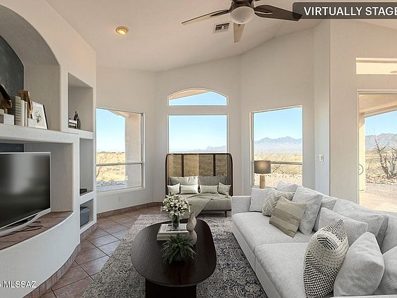 Nestled atop a scenic hill, this pristine home offers panoramic views of Sta Ritas, Elephant Head and Tumacacori Mtns. Thoughtfully designed with split floor plan, home features 3 spacious bedrooms and two bathrooms, creating a perfect blend of comfort and functionality. The inviting great room, complete with gas fireplace, sets the stage for relaxtion, while the kitchen is a chef's delight with custom storage, Corian countertops, a propane stove and generous pantry. Everywhere you turn, the beauty of the surrounding landscape pours in. This home has radiant floor heating providing warmth and elegance throughout the home, complemented by efficient propane heating, central air and an evaporative cooler for those hot dry days. The laundry area is perfect for a flex room. A flex room is what you want it to be. office, gym, hobby room. Step outside to the expansive backyard, a second level has an open shed with 110 and 220 voltage, grated this could be a great area for an RV. There is even room for a pool. The electric wire fence keeps unwanted animals out of the yard, while you enjoy the views. This home radiates pride of ownership, seamlessly blending comfort, charm, and thoughtful details into a truly remarkable hilltop haven!!