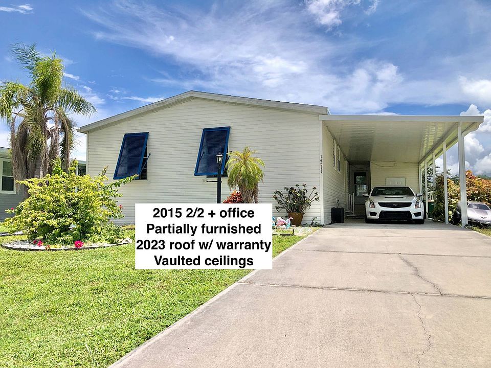 14511 Kipling Ct. Port Charlotte, FL 33953 Vizcaya Lakes, 55+ A Sun Communities, Gorgeous, meticulously maintained Park. Mobile Home on Leased lot. Pets allowed. Lot rent of approximately $900 monthly. On a cul-de-sac. Spacious, Vaulted ceilings, Move in ready. 2015 2 bed/2 bath w/office. 1532 sq ft. Roof 2023 Siding 2023 Welcome to Port Charlotte, FL - Your Perfect Florida Retreat! Nestled on a peaceful cul-de-sac in the sought-after 55+ Vizcaya Lakes, a Beautiful Sun Communities Park, this 2015 2-bedroom, 2-bath home with office offers comfort, style, and plenty of space with 1,532 sq. ft. of living area. The home has a new roof (2023) and new siding (2023), so you can move in with peace of mind. Enjoy bright, airy interiors with vaulted ceilings throughout, a mix of laminate, tile, and carpet flooring, and the convenience of inside laundry. The fully furnished interior (furniture just 4 years old) means you can start enjoying the Florida lifestyle right away. Relax year-round in the enclosed lanai with glass windows and its own AC unit, creating the perfect bonus living space. Outside, you'll find an 8x12 shed for all your storage needs. Vizcaya Lakes is a pet-friendly, active community with beautiful grounds and an affordable lot rent of about $900 per month, giving you access to fantastic amenities in a vibrant social setting. Don't miss your chance to own this move-in ready home in one of Port Charlotte's most desirable 55+ communities-schedule your showing today and start living your dream Florida lifestyle! The lot rent for this mobile home is approximately $900 and includes trash removal, sewer, lawn maintenance, and access to all community amenities. (Pool, Hot tub, Pickle Ball, Shuffle Board, Lake with fishing and more.) Florida MH Sales, LLC cannot guarantee or warrant the accuracy of any property's information, measurements, or condition. Measurements are approximate. All homes are sold as-is, and a personal or professional inspection is encouraged. Additional personal property conveys "as-is" with no value. Lot rent is set by the community and is subject to change. All buyers must be approved by the community before closing on a negotiated sale contract.