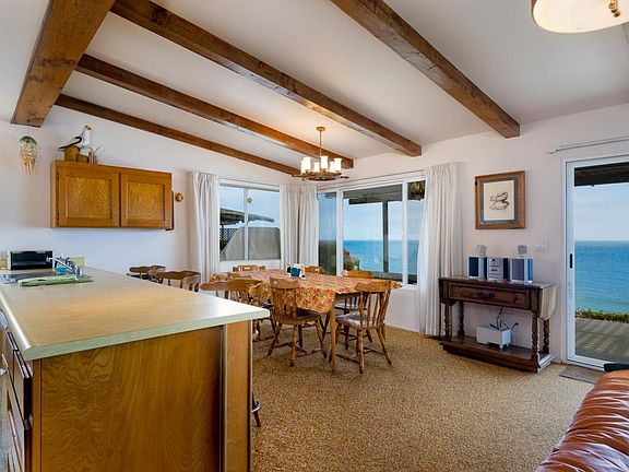 Showing for back up. Beachfront! Spectacular ocean and coastal views all the way to Point Conception are enjoyed from this rural & private south facing retreat. Open floor plan w/ expansive views & light, cozy FP & open beams. Covered patio- perfect for outdoor beachfront living. Direct access to private sandy beach & view deck. 80' beach frontage set on .55 acre, off gated lane. Outdoor shower