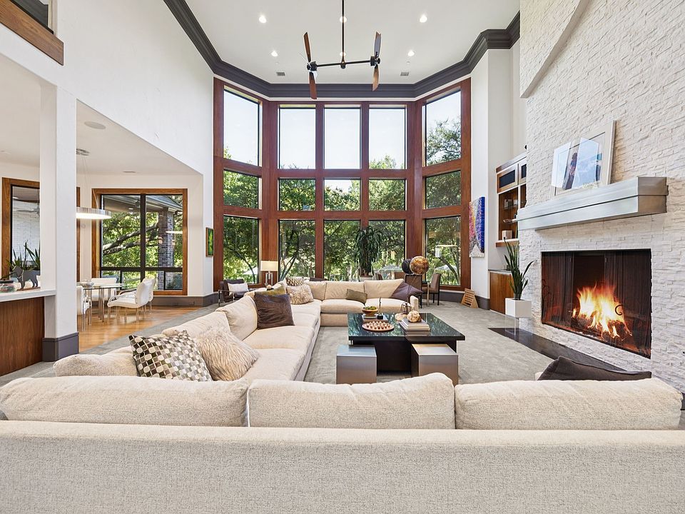 Perfect for entertaining, the home features multiple fireplaces, elegant dining, and a spectacular living room showcasing a 23’ tall unique white stone
