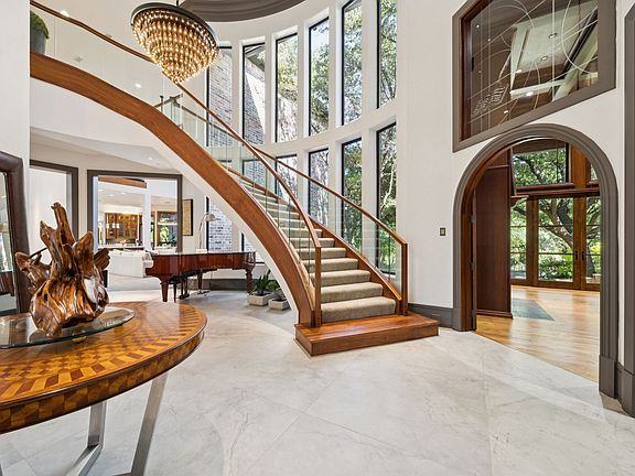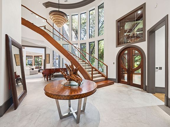 The entry impresses with 10’ mahogany and glass curved doors, a sweeping staircase, and expansive porcelain flooring flowing into living spaces which have commanding views of the pool, creek, and courtyard.