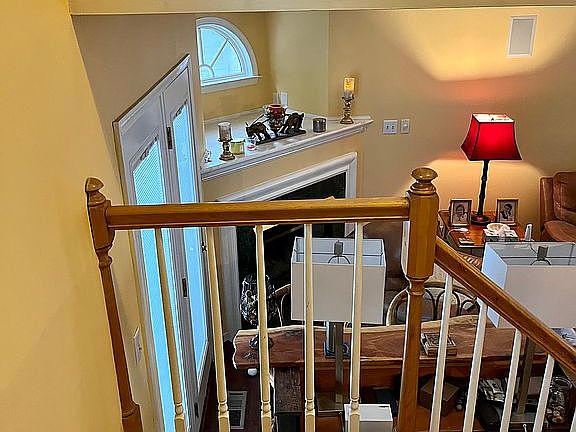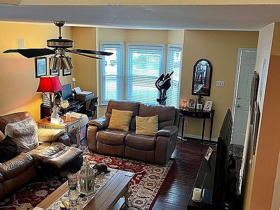 4 bedroom Traditional style 2 story home for sale by owner . 1823 square feet . Hardwood floors , in living , dining area , bedrooms, and hallway . Carpeted stairs and tile in downstairs half bath . Linoleum in remaining bathrooms, laundry room and kitchen . One car garage . Deck with entrances to both the den and kitchen.