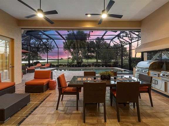 This striking three-bedroom, two-and-a-half-bath, open layout residence offering nearly 3,000 square feet of refined living space, oversized 3.5-car split garage, has one of the most spectacular views, on a cul-de-sac in the prestigious gated community of Country Club East. This incredible home blends architectural grandeur with modern sophistication. An impressive arched portico framed by twisted columns and manicured landscaping create a grand first impression. Through the custom glass door, soaring ceilings, designer lighting, porcelain tile flooring, and abundant natural light through impact-resistant windows and doors set a tone of relaxed elegance. The open floor plan flows effortlessly through the formal living and dining areas into a designer kitchen showcasing custom wood cabinetry, an oversized granite island with stunning onyx quartz countertops and GE Profile stainless appliances, including a gas cooktop with vented hood, built-in oven, warming drawer, convection microwave and refrigerator. Just off the kitchen, you’ll find a built-in office nook, dry bar with beverage refrigerator and access to a convenient pool bath. Expansive sliding glass doors open to an oversized screened lanai with hurricane-proof Storm Screen for added protection, and newly painted and re-screened cage, designed for year-round enjoyment. It comes complete with an impressive outdoor kitchen, saltwater, oversized pool and spa, outdoor shower, and breathtaking views of the 14th hole on the golf course and tranquil lake. The primary suite offers a serene private retreat, featuring plush carpeting, custom walk-in closets and a spa-inspired bath with split vanities, freestanding soaking tub, glass-enclosed shower and private water closet. Past the hallway of four double closets for extra storage, you’ll find two guest suites with custom closets that share a stylish Jack and Jill bath, while a dedicated office with wood flooring provides the ideal workspace. The laundry room with custom cabinetry ensures convenience and functionality throughout. The home also features a whole-house generator and full security system providing seamless comfort and peace of mind, a circulating hot water heater, in-house vacuum system, an oversized 3.5-car oversized garage that includes your temperature-controlled workout area and extra storage and utility sink, brick paver driveway and meticulous landscaping. In Country Club East, one of Lakewood Ranch’s sought-after villages, residents enjoy 24-hour gated security, resort-style pools, fitness centers, parks and scenic walking trails. Optional membership to The Lakewood Ranch Golf and Country Club provides access to four championship golf courses, tennis and pickleball facilities, fine dining venues and an engaging social calendar, all just minutes from Waterside Place, Lakewood Rach Main Street, boutique shopping and Gulf Coast beaches.
