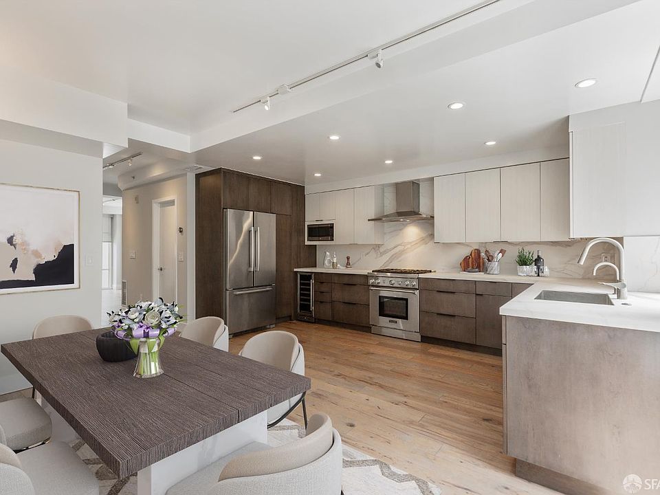 The Midtown - in the midst of it all. This gorgeously renovated 2BR/2.5BA townhouse-style condo is the one you've been waiting for. The end unit is surrounded by windows with city outlooks and filled with natural light. Upon entering, you are greeted to a chef's kitchen with Neolith quartz countertops & backsplash, high-end S/S appliances including a Thermador gas range & Bosch refrigerator, wine fridge and modern cabinetry. There is also a dining area, large half bath, laundry room and living room with a walk out balcony. As you ascend the stairs, you'll find two spacious en-suite bedrooms with office/reading nooks and custom closet organizers. Lofty ceilings and beautiful wide-plank hardwood floors add a modern touch. One car deeded parking with EV charging in a secured garage accompanies the unit. Google Fiber Webpass included. Conveniently located at the crossroads of Polk Gulch, Pac Heights, Nob/Russian Hill and Union Square. 100 Walk Score!