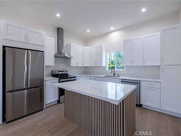 The open-concept kitchen seamlessly connects to the living area and features a large center island with wood paneling, quartz countertops, and all-new stainless-steel appliances, including a refrigerator, electric stove, microwave, and a vented hood. Ample storage is provided with sleek, self-closing drawers and cabinets.
