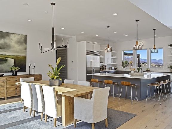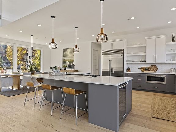 Easily bring in fresh mountain air with grand sliding glass doors to the back patio. The home offers airy and open spaces on two levels, with two bedrooms on the main level flanking the spacious main living space. The kitchen offers quartz counters with large island, Wolfe range, large Subzero fridge, two-tone cabinets, open shelves, large pantry, and butler's pantry with sink and direct outdoor access. Perfect for entertaining, the great room is open to the outdoor living space drawing family and friends to immerse in nature's beauty. Invite friends and family to make a wood fired pizza or barbecue in the outdoor kitchen, or just linger under the pergola, in the hot tub, or under the sky and watch the sun set over the Wasatch Mountains.