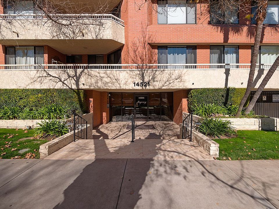 Sherman Oaks dream home two blocks SOUTH of Ventura Boulevard. Spacious TOP FLOOR CORNER UNIT penthouse unit with 13-foot HIGH CEILINGS LIVING SPACE and tons of NATURAL LIGHT. Spacious light-filled living rooms with high ceilings, stone fireplace, built-in shelves, office nook & balcony with gorgeous south-facing view of the hills. Large Dining room leading to updated kitchen with quartz counters and stainless GE appliance, double oven, 5 burner stove and sunny breakfast area. Oversized Master bedroom with 2 walk-in closets & a large wall closet. Master bath with double vanity & separate tub/shower. Second bedrooms with a walk-in-closet and a wall closet. Amenities: POOL, jacuzzi, private gym, community patio, conference room & lobby. Two assigned side-by-side parking spaces & additional STORAGE unit in garage. Quite area but walking distance to Restaurants, Shopping, Grocery Stores, and more all within 400 feet. Easy access to the 101, the 405, Sepulveda, and Beverly Glen.