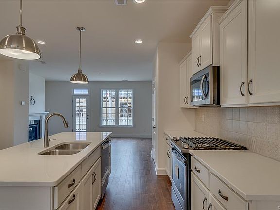 Welcome to Winterfield Park! The Willaim TBB by Main Street Homes. Gorgeous light filled END UNIT townhome w/ 2 large Bedrooms, a first floor FLEX ROOM and 3.5 Baths. Hardi plank exterior and FULL FRONT PORCH with metal roof nod! This home is two levels above grade with finished basement and 2 car rear-entry garage. The 1st floor Flex room offers a storage closet and full finished bathroom and makes for a wonderful home office, man cave or guest suite. The Open floor plan on 2nd level is seamlessly tied together with hardwood floors throughout. Show stopper gourmet kitchen w/sought after leathered granite countertops, 8 foot Island, soft close kitchen cabinets, built in dry bar with wine rack, all accented with modern brushed nickel finishes. The kitchen opens to the expansive Great Room with gas fireplace. The entertainment space continues to a massive 8x20 rear deck with privacy screen. This lot in particular has additional privacy, siding to green space! Upstairs is the Master Suite with a large Walk in closet & en suite bath with ceramic shower & floor and double bowl vanity; Large Guest Suite with en suite full bathroom; laundry.