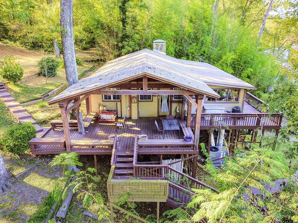 Discover the natural beauty and serenity of Lake Placid from this inviting waterfront cabin-style residence in Tyler. Tucked among mature shade trees and bamboo for privacy, this home sits directly on the lake’s edge and offers panoramic water and forest views from nearly every room. Multi-level wood decks and covered porches extend the living space outdoors, creating perfect vantage points for lake views and gatherings beside the water. A private dock provides direct lake access for fishing, paddleboarding, or kayaking. There are 2 separate storage sheds as well as two storage areas beneath the house. Inside, the open-concept great room features wood-paneled walls, vaulted ceilings with exposed beams, and a stone-faced fireplace that anchors the space. Large windows frame the lake setting and fill the interior with natural light. The kitchen offers long counter runs, abundant cabinetry, and a wall of picture windows overlooking the trees and shoreline. A flexible game room or dining area connects seamlessly to the main living space, creating an easy flow for entertaining. The spacious covered deck includes seating and dining zones under a timber-beam roof with ceiling fan. A gently sloped pathway leads to the dock and shoreline. Located approximately 9 miles from downtown Tyler, with groceries, coffee shops, and restaurants within 10 minutes. Enjoy a rare combination of lake access, wooded privacy, and proximity to town—a true East Texas hideaway on scenic Lake Placid.