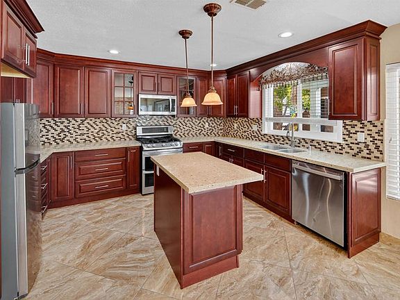 Stone fireplaceQuiet cul-de-sacCustom cabinetryRich marble tile floorsPaver patiosMosaic tile backsplashFirst-floor primary suite