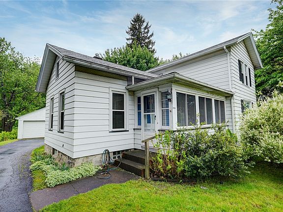 Welcome to this vintage, versatile 3–4 bedroom, 1.5 bath home located in Webster, nestled on a generous 0.50-acre lot. With over 1,600 sq. ft. of living space, this inviting two-story home offers flexibility and potential, featuring two first-floor bedrooms—ideal for one-level living or a home office setup. Relax on the enclosed front porch, the perfect spot for morning coffee or evening wind-downs. Inside, enjoy comfort year-round with three efficient mini-split AC units and an upgraded 200-amp electrical service. Other features of this home include: hardwood floors, updated full bathroom, first-floor laundry, water filtration system, all kitchen appliances, washer & dryer, glass block windows in basement with walk out to backyard, updated septic system. The two-car garage includes an attached shed for extra storage. Enjoy your own backyard oasis with a spacious, reinforced deck—perfect for a hot tub—overlooking a lush, park-like yard and a peaceful stream, ideal for relaxing or entertaining. Ideally situated just minutes from the Village of Webster, with local shops, restaurants, and the charming Gazebo Park all within walking distance. Offered in **as-is condition**, this home is a wonderful opportunity to own an affordable property in a prime location—bring your vision and make it truly your own!
