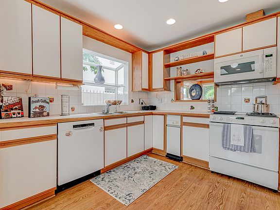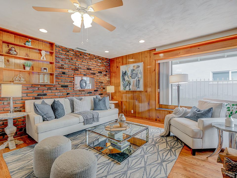 Spacious single lever floorpan featuring beautiful living room with brick accent walls and built-in shelving, laminate flooring throughout (no carpet!), large dining area plus breakfast nook, nice size fully equipped kitchen with all appliances, including fridge, stove/oven, microwave, dishwasher, and a kitchen bar. Both bedrooms are generous size with spacious closets. Primary bedroom has a spacious en-suite bathroom, walk-in closet with organizers, and sliding doors that open up to the backyard. Both bathrooms have bathtubs with jets.