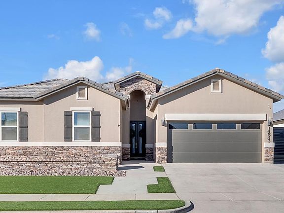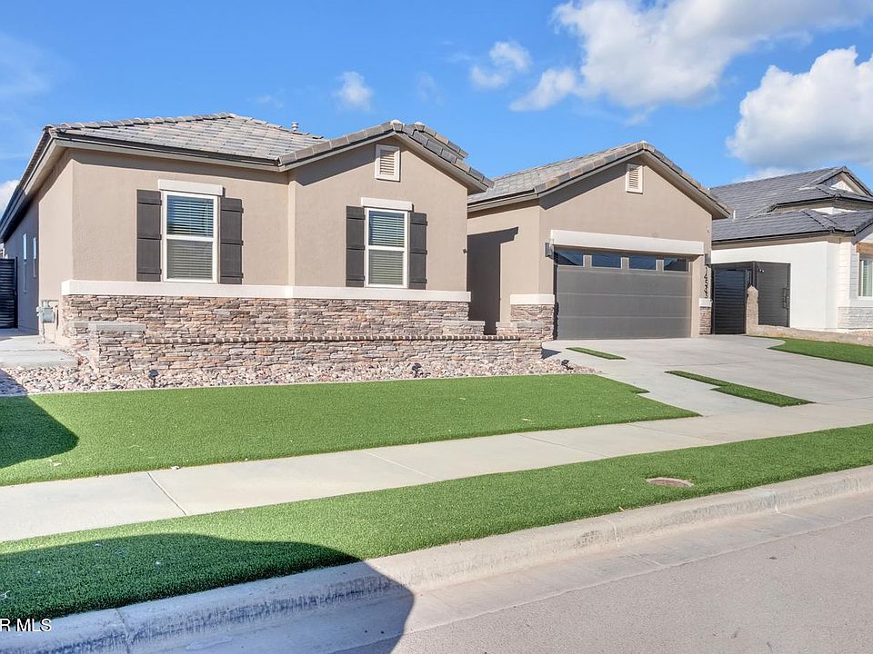 Striking curb appeal in Tierra del Este with a modern façade, stone accents, and low-maintenance artificial grass in both the front and back yards. Step inside to a spacious open-concept living area with a sleek built-in fireplace, a dedicated theatre room, and a stylish dining space. The stunning kitchen features contemporary cabinetry, stainless steel appliances, and elegant counters ideal for cooking and entertaining. The huge master suite offers a spa-like bath with his-and-hers vanities, walk-in shower, soaking tub, and generous walk-in closet. A large utility room adds convenience. The backyard is built for gatherings with expansive turf, dual covered patios, and a second outdoor fireplace. A standout home with luxury and comfort—don't let it be the one that got away!
