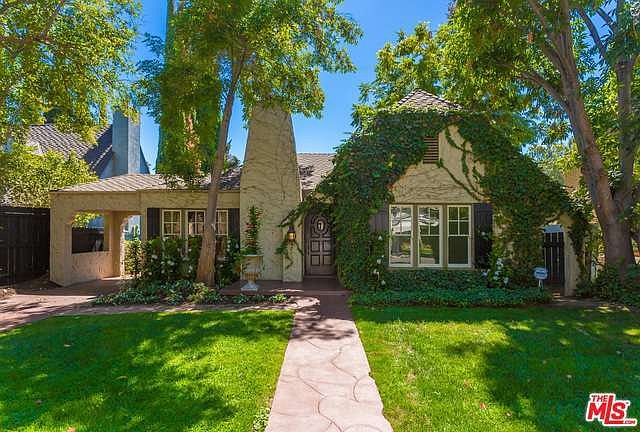 An exquisite blend of La Plante's 1927 classic charm and modern amenities, this elegant 3 bedrooms, 1 bath home boasts a tremendous outdoor space and a private cabana area. Set on a tree-lined street with lush landscaping, a detached garage at the end of a long driveway, this unique home is located in coveted Sherman Oaks. Coved ceilings, dark wood floors and a dramatic fireplace greet you at the entrance. Picture windows in the living room look out to lush flowers and the porte cochere. Spacious cook's kitchen with stainless appliances, carrara marble counter, center island flows seamlessly to formal dining room, centered by a Giltwood European chandelier hanging from a ceiling medallion. Large full all-white bathroom feels more like a spa bath. To experience the outdoor, open the double French doors, step down to the patio, enjoy the lush grassy tranquil grounds, the Balinese lounging canopy bed in the draped cabana area-- a perfect setting for al fresco entertaining. Must-see!
