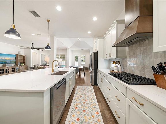 Welcome to this stunning home built in 2018 and within 15 minutes walk to Downtown Dunedin (3 minutes by golf cart). Nestled in a private, gated neighborhood of just 20 homes, where lush landscaping, mature trees, and impeccable curb appeal create an inviting first impression. Step inside to a bright and open concept floor plan designed for both comfort and style, featuring a desirable split-bedroom layout that enhances privacy. The show-stopping kitchen is the heart of the home, boasting quartzite countertops, stainless steel appliances, a gas cooktop, a walk-in pantry, and a gorgeous custom wood vent hood that adds warmth and character. The kitchen opens to an elegant coffered-ceiling dining area and family room with fabulous hardwood flooring throughout the living area. Expansive sliders in the spacious family room seemlessly blend indoor and outdoor living. The sliders open fully, leading to an entertainer's dream backyard, featuring a stunning resort-style, salt-water pool with sleek modern finishes, that is both heated and cooled (2025), an outdoor kitchen (2025), and generous deck space for lounging and hosting friends and family. The primary suite is a true retreat, offering a wall of windows overlooking the spectacular pool and the private, fenced backyard. A huge custom walk-in closet and spa-inspired ensuite with double sink vanities elevate the space to luxury status. Three additional first floor bedrooms are equally well-appointed, with plentiful closet space. The single story layout includes a 566 sq.ft. second story bonus room with a full bath and walk-in closet. There are limitless option with this space, making it a perfect in-law suite, playroom, media room, man cave or office! High ceilings, an indoor laundry room, 3-car garage, whole house generator (2025), a 10' x 12' storage area over the garage with pull-down staircase provide everyday conveniences with plenty of room for a golf cart to enjoy the quick ride to vibrant downtown Dunedin, its charming shops, restaurants, and waterfront beauty. This exceptional home blends elegance, functionality, and an unbeatable location.