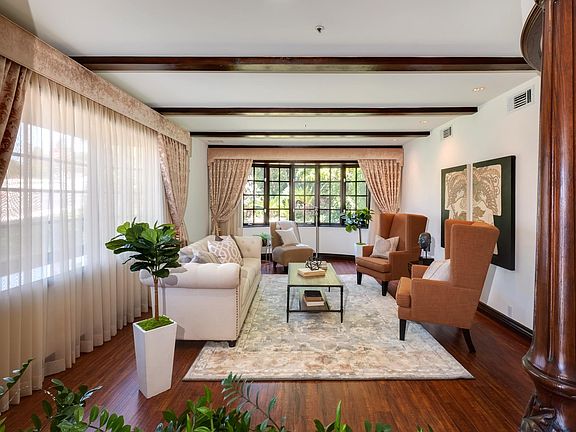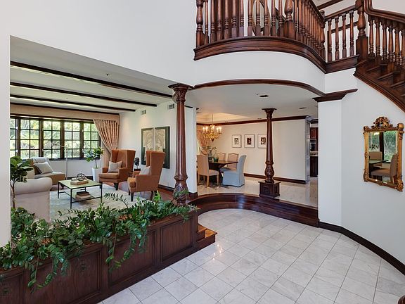 English Tudor Masterpiece Custom built to perfection, Impressive & Elegant 4811 Sq. ft approx.of living space, Formal entry with 20'+ cathedral ceiling, Gracious semi-curved debutante Stairway Architectural details throughout the property add unique and Elegant character. Formal Living Room, Formal Dining, Gourmet Kitchen large enough for even the most serious of chefs, Breakfast Room w vaulted wood ceiling, Generous Guest Bath, Large Family Room w/ custom built-in bar, coffered ceilings, with wood engraved cabinets. French doors leading to private patio w/ in-ground spa; perfect for relaxation & entertainment Additionally downstairs is a Bedroom en-suite w 3/4 bath perfect for Au-pair/extended families attached spacious 3 car garage. Upstairs are 2 generously sized bedrooms sharing a full bath, a second laundry room w/sink & a very impressive massive Master Suite Retreat w vaulted beamed ceilings in sitting area, two sided fireplace, Wet bar & views to downtown