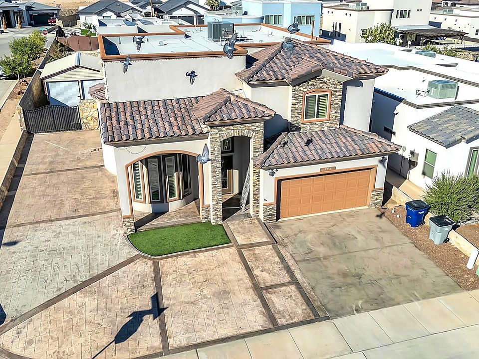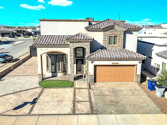 Beautiful East El Paso Home! Corner tri-level on a 7,730 SF lot with great curb appeal. Low-maintenance front yard with synthetic grass, stamped concrete, and room for an RV. Welcoming porch with lots of natural light inside. The main level features a cozy sitting room and a spacious primary suite with a stylish bath. Second level, enjoy a dining room, breakfast area, and modern kitchen with SS appliances, granite counters, and island. The top level offers a large loft, perfect for family time or movie nights.