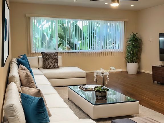 Sparkling poolPool in common areaModern finishesWood style laminate floorsPristine quartz countertopsCeiling fanRemodeled kitchen