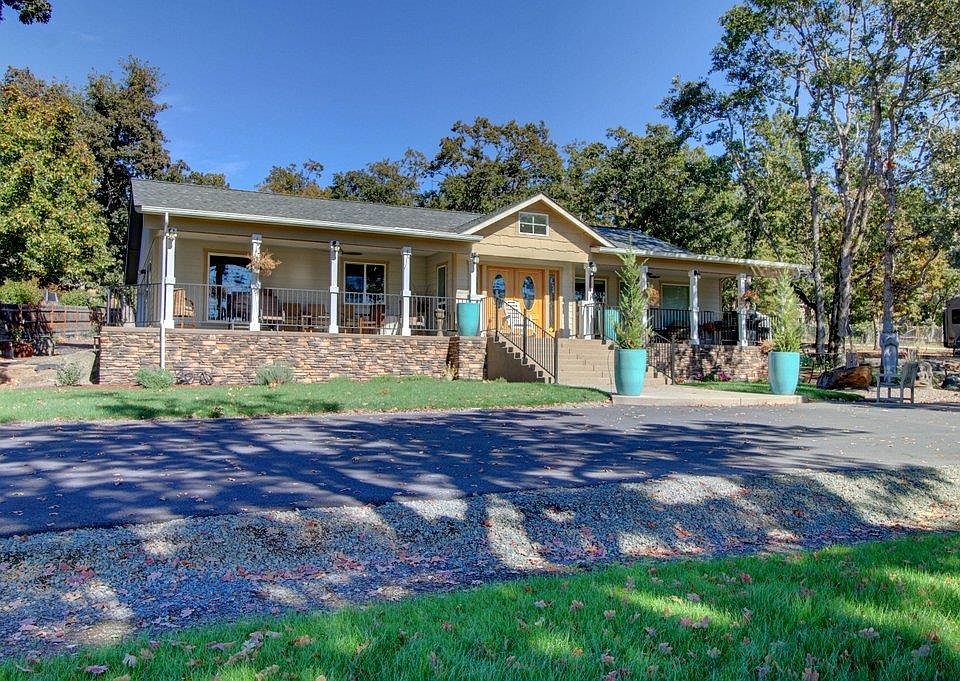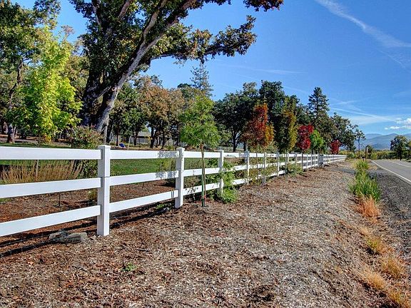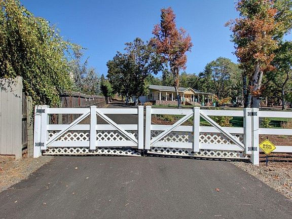 A Beautiful Home located on 2.4 acres. Beyond the gate and white rail fence, you will be delighted by the park like surroundings with tall trees, green grass and Mountain views. This includes a 140 foot water feature that begins with 2 waterfalls and flows on down a babbling brook into a large pond. Enjoy all of it from the large front porch. Enter the home thru the grand hall and into a giant living area, with cam lights and Cherry hardwood floors. The magnificent eat in kitchen, includes plenty of beautiful cabinets, granite counters, 6 burner stove, gas oven, and an island that spans the entire kitchen area. 2 bed/2 baths with marble counters, and the master features 2 sinks and a separate tub and shower. This property also has a 26x36 workshop with 2 garage doors, an RV Pad with water, power, cable and dump site. There is even a chicken coop. The property is irrigated, and has sprinklers and a drip system. Has city water, and 7 building sites, and can be hooked up to city sewer