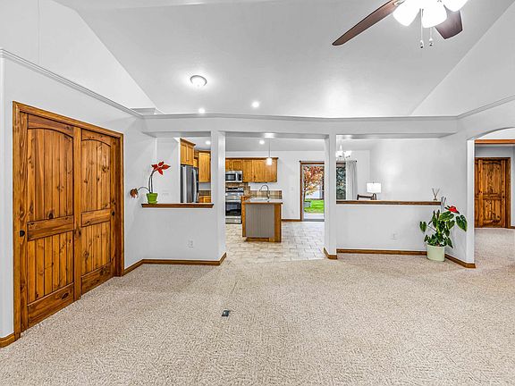 The open concept floor plan is built for entertaining, with a large living room, dining room and open kitchen. Beautiful cabinetry with crown molding and countertop space make prep, cooking, and cleanup a breeze! Berber Carpet and plant shelves add special touches to this home.The split floor plan features two guest bedrooms on the east end of the home with full guest bath. Master is on the west side of the home, features a gorgeous master bathroom with Large soaking tub and tiled shower. His and hers sinks are always a bonus! Master bedroom has great views of the back yard with natural sunlight. There is a dedicated laundry room with sink that comes off of the attached garage. Outdoors you will be thrilled to find the entertainers space continues- with a large custom built patio and an ample size yard for all your games! Plus 3storage sheds for all your tool and toys. Completely fenced in backyard for your privacy and quiet time. Garage has it's own heat and cooling system if you want to use it as a workshop. This home is located within walking distance to the high school and is convenient to the hospital, downtown area, and additional schools. Located in Cunningham Orchards Estates Subdivision.