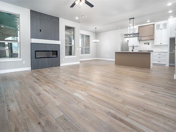 Step inside to a bright, open layout featuring soaring ceilings, abundant natural light, and beautiful wood-look flooring. The spacious living room showcases a sleek, contemporary fireplace and flows seamlessly into the chef’s kitchen, complete with quartz countertops, custom cabinetry, a large center island, gas cooktop with pot filler, built-in appliances, and a walk-in pantry. The dining area overlooks the backyard and covered patio, perfect for entertaining or relaxing outdoors.