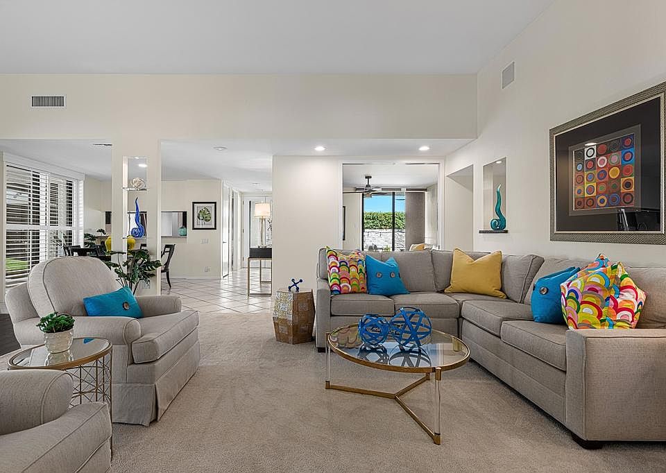 Spacious Stand-Alone Condominium in South Palm Springs. Located in the desirable Twin Palms neighborhood of South Palm Springs, this beautifully maintained home on fee land (you own it!) offers comfort, privacy, and a location just minutes from downtown, restaurants, and shopping.With 2 spacious bedrooms--each with an ensuite bath--a separate den, powder room for guests, and 2,181 square feet of well-planned living space, this home is designed for both everyday comfort and effortless entertaining. Soaring 11-foot ceilings create an airy, open feel, while the generous living room, formal dining area, and light-filled eat-in kitchen flow seamlessly together.Nearly every room opens to a series of private patios, offering peaceful outdoor areas perfect for relaxing or dining al fresco. Enjoy beautiful views of the lush community greenbelt and sparkling pool, while the gated front courtyard adds privacy and a warm welcome. An attached two-car garage with built-in storage provides added convenience.Whether you're seeking a full-time residence or a seasonal retreat, this Twin Palms gem delivers style, space, and an ideal location to experience the best of Palm Springs living.