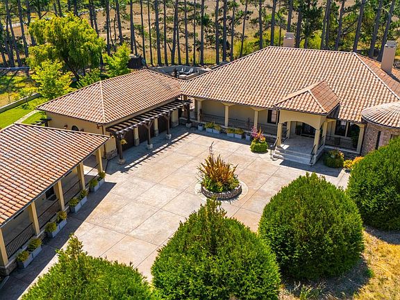 Discover an exquisite, gated Mediterranean-style estate nestled on 9 acres of serene Sonoma County countryside, minutes from Bodega's coastal charm and towns like Petaluma, Bodega Bay and Sebastopol. The property offers a luxurious retreat with sweeping views, privacy, and refined design, a dream for those seeking elegance and tranquility amidst rural beauty. The main residence, built in 2007, spans approximately 3,789 sq ft, featuring 4 bedrooms and 3.5 baths designed with intentional separation for privacy and comfort. The primary suite is strategically tucked away from the communal areas and boasts luxurious touches such as iron-framed doors and windows, and heated travertine flooring. A beautifully appointed 640 sq ft casita, crafted with the same Mediterranean elegance as the main home, offers a welcoming space for guests. The property includes an expansive 5,000 sq ft outdoor entertainment courtyard, complete with a fully equipped kitchen, an inviting outdoor fireplace, an authentic imported Italian pizza oven, and tranquil water features, perfect for al fresco gatherings and leisurely afternoons. Included is a classic two-story barn with 5 stalls, tack room and paddocks. Upstairs in the barn is unfinished space with electricity, offering endless possibilities.