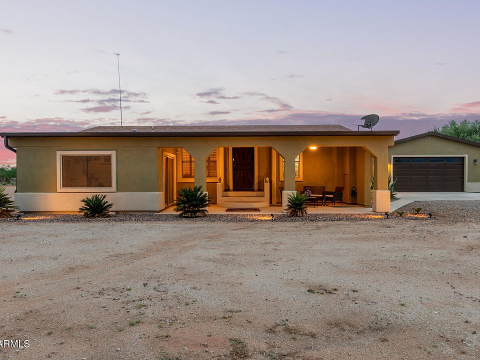 Discover peaceful desert living with breathtaking mountain views on over two acres for endless possibilities. This beautifully updated home offers a spacious open layout with split bedrooms, high ceilings & new high-end laminate wood flooring throughout. The kitchen shines with a new stove & new dishwasher. Major 2023 updates include a new roof for home, garage, & shed, two new HVAC units, fresh exterior paint and a new water heater. Additional features include a whole-home water softener and conditioning system, new water tank, new security system, new solar gate opener, and new gutters. An attached guest room with private exterior entry is perfect for a home office, gym, or guest suite. The detached garage features overhead storage, and the workshop is ideal for hobbies or projects. Right out the back, the cozy covered patio provides a space to unwind & relax. The convenient shed is perfect for storage or a workshop. Furthermore, the expansive backyard offers endless possibilities to get creative with room for a pool, RVs, a corral, and all your toys! What's not to like? Escape the bustle of the city and enjoy life in the countryside even though shopping is less than 5 minutes drive! Ask for info about hauled water! Owner is including a truck with water tank for hauling water. Cost to haul yourself is $20-40/month or around $200 for automatic delivery. See walk through video to check out this amazing space!