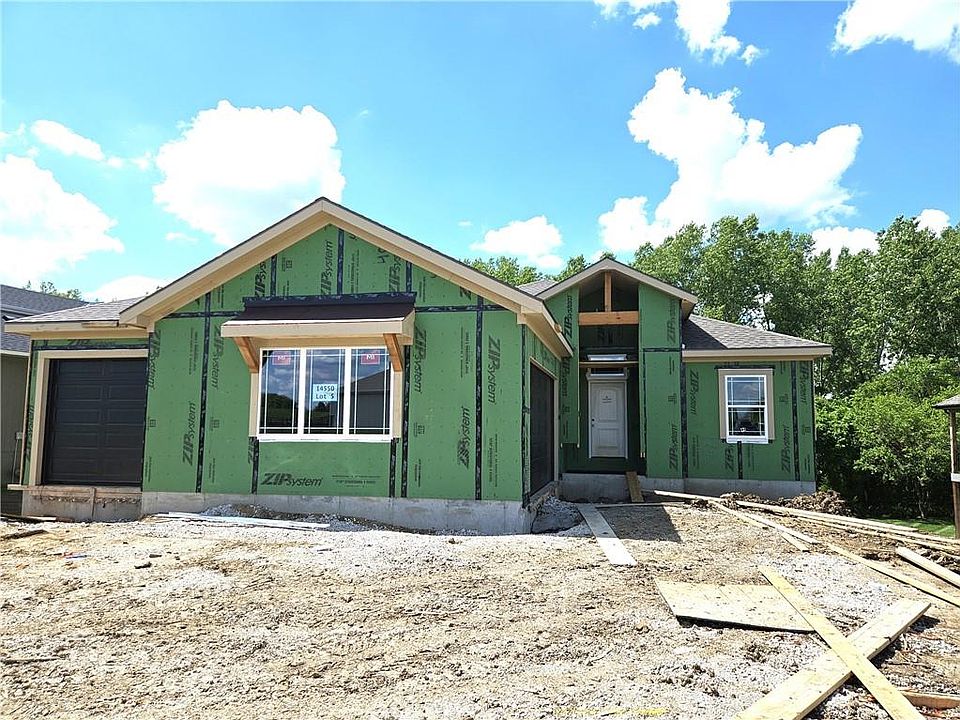Lot 5 Boulder Villas of Falcon Lakes, a beautiful golf course community!! Popular Grayson plan by New Mark Homes. Home is UNDER CONSTRUCTION. Finished photos are of a PREVIOUS MODEL. This home is on a WALKOUT and TREED lot with a back staircase and tons of windows to enjoy the view from both floors all across the back - dining area, great room, primary bedroom as well as downstairs rec room and third bedroom. Tons of storage and plenty of space for a fourth bedroom. You will also find an EXTRA LARGE GARAGE - with two side facing (22'x26') and one front facing (10'x 24'). Plenty of time to make selections!! Plans call for granite countertops, gas cooktop, larger island with 24" overhang, upgraded base and casing, trim feature wall on stair landing, 2, 3 an 4 inch hardwood floor and upgraded lighting. All homes feature inground sprinkler system and required landscaping. The monthly HOA dues of $230 per month provide lawn mowing, trimming and treatments, sprinkler turnon and winterization, as well as snow removal over 2". The annual HOA dues of $550 per year cover the pool, picnic pavilion, playground, pickleball and tennis courts, the pool and common grounds maintenance. Falcon Lakes is a hidden gem conveniently located off K-7. It is only 10 minutes to the Legends Shopping and Entertainment district, 30 minutes to the airport and to Lawrence. Acclaimed Basehor-Linwood Schools. Estimated completion is Fall 2024.