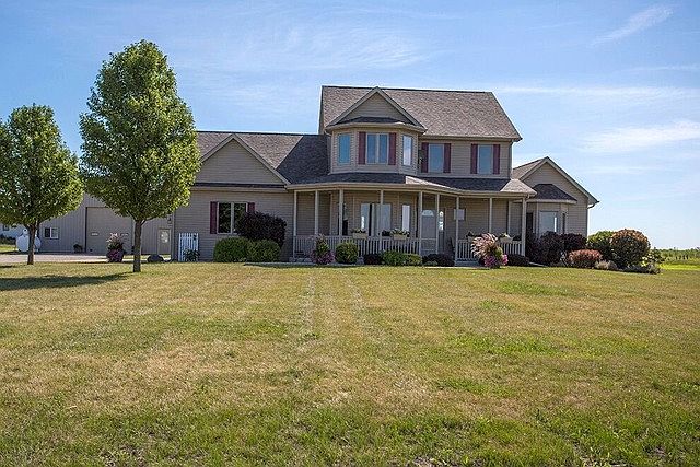 Beautiful custom built home nestled on 5 acres with out building. This home features a first floor master suite w/luxury bath,2 story great rm w/ fpl,large eat-in kit w/42 "cherry cabinets,s.s appliances,1st floor laundry,generous bdrms w/Jack & Jill bath,cathedral ceilings,loft, hardwood floors and freshly painted throughout. 2+ car attached garage,full bsmt plumbed for bth ,36x72 machine shed w/12x12 overhead door,14 ft ceiling,heated floor,220 electric& water. Newer roof,gutters,downspouts,hot water heater,stove,ref & microwave. Enjoy peaceful living with views of open areas from your front porch. Don''t miss this unique opportunity.