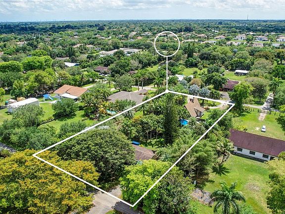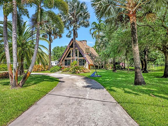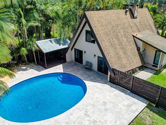 One of a kind A-Frame home, nestled on nearly an acre w/ convenient front & rear access in one of Davie's best neighborhoods. 3 bed, 2 bath pool home PLUS fully equipped charming 2 bed, 1 bath guest house in what feels like tree lined Coconut Grove. Main residence accessible off 24th St features updated open kitchen, wood-burning fireplace & two 1st floor bedrooms opening to pool area; spiral staircase leads to secluded master suite above. Guest house, accessible via 23rd Ct, features a complete kitchen, cozy living space, bedroom, bath & office/bed - perfect for guests/rental income. Large storage shed, lush mature fruit trees & expansive space for all your hobbies, truly a rare find. Hurricane impact windows & doors. A true treasure offering privacy, space, versatility & A Rated Schools.