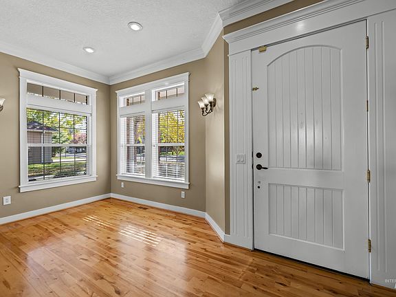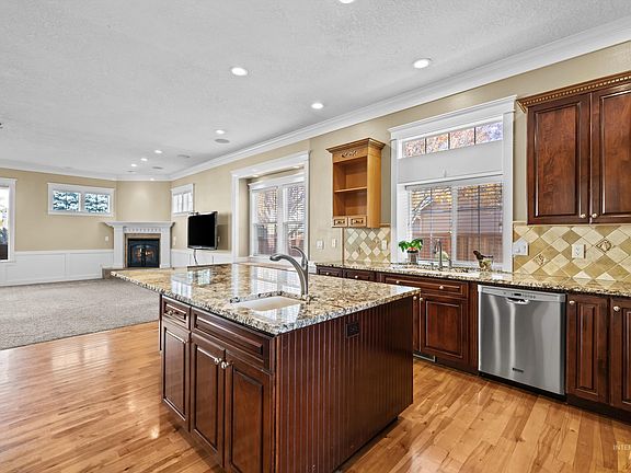 This 4-bedroom, 3-bath home with an additional bonus room offers plenty of space for a growing family or those needing extra rooms for guests or a home office. The large gourmet kitchen with an 8-foot island and granite counters provides ample space for cooking and entertaining. 9-foot ceilings, hardwood floors, wainscoting, and wood-wrapped windows offer a warm custom feel inside. The lushly landscaped yard offers large mature trees, Trex deck with a built-in hot tub, a covered patio area, and ample storage or workshop area. Centrally located where Meridian, Eagle, and Boise come together, Bristol Heights is perfectly positioned for ample shopping, dining, and more with less driving!