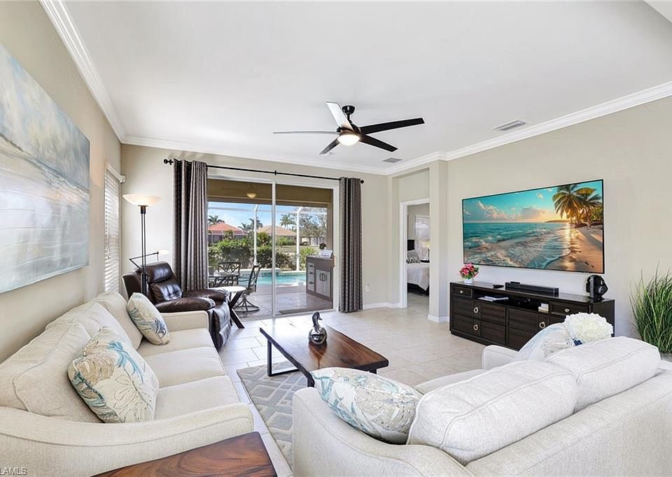 Turnkey elegance awaits in this impeccably maintained property, featuring three bedrooms, two bathrooms, and a versatile open den. This home is a boater's dream, offering an extended garage designed to securely accommodate your vessel indoors. Sold fully furnished with high-end items, the residence features numerous updates, including a new water heater (installed in 2025) and an insulated garage door. Enjoy the heated, west-facing pool and outdoor kitchen, which offer fabulous view of the pond and sunset. The property have been upgraded with crown moulding. The property has window shutters and solar shades in the lanai. Built in 2016 and lightly used, with only 4 to 5 months of annual use, every detail of this property was crafted with efficiency in mind. The home is located just 9 miles from the vibrant heart of Naples, providing easy access to top-rated restaurants, shops, and conveniences.