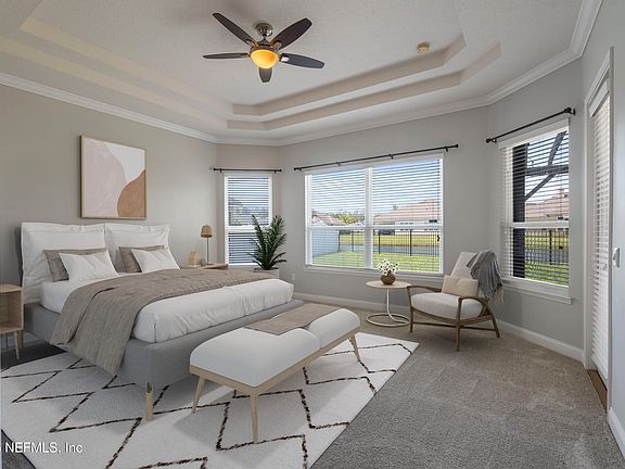 GATED COMMUNITY - BETTER THAN NEW! This bright and spacious home offers soaring ceilings, an open-concept layout, and abundant natural light throughout. Enjoy a gourmet kitchen with ample counter space, a formal dining room for entertaining, a cozy breakfast nook, and elegant 18'' tile flooring. The versatile bonus room is perfect as an office, playroom, or non-conforming 5th bedroom. Guest rooms provide flexibility for family or visitors. The extended driveway offers additional parking, and the garage features built-in storage and a professionally finished epoxy floor. Sitting on a rare 80-ft lot, the home includes a fully fenced backyard—ideal for pets, kids, or relaxing outdoors. Located in a sought-after gated community with resort-style amenities: pool, fitness center, tennis courts, playground, and more. Zoned for the highly rated Clay County School District. This move-in ready gem combines comfort, functionality, and style—perfect for modern living!