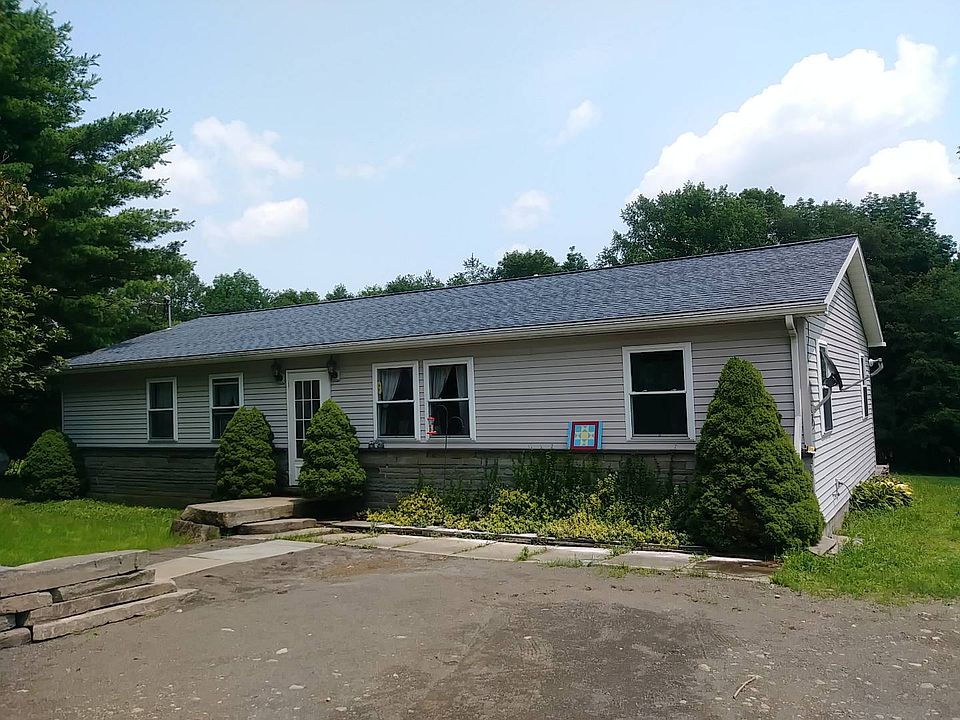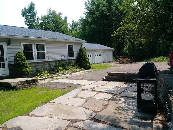 Quiet country stick built house in Chenango County, Town of Bainbridge. This 3-bedroom 2-bathroom, stick built home includes an oversized 2-car detached garage with work area and storage. The home is tucked back off the road with nice front and back stone patios, and nearly 500 feet of stone wall that lines the front of the property along the road, all built from natural Bluestone that was cut from a local quarry by the owner. The home is being sold with a new stove, dishwasher, drier plus many other upgrades throughout. The family room has a propane fireplace that offers an additional heat source to the boiler that supplies the baseboard heat and hot water. Kitchen comes with nice oak cabinets and flooring plus a French glass door that brings you out to the back 15'x20' patio overlooking the large back yard which is perfect for entertaining friends and family or just for your own peaceful enjoyment. Another private driveway leads to the back of the property that may be a potential home site or camp. In the woods there are 2 small ponds for the wild life, wild apple trees, mature hard and soft woods, and brush cover along with the neighboring farm fields to help bring in the large bucks and small game. There is plenty of space for a garden or maybe some chickens or other livestock if you so desire along with a good supply of firewood if you choose to put in a fireplace, wood stove or just to have a bonfire. Property is located just a short distance from Bracket Lake, just over 3-hours from NYC, a little over 1-hour from Cooperstown and Ithaca, and 30-minutes from Binghamton and Oneonta.