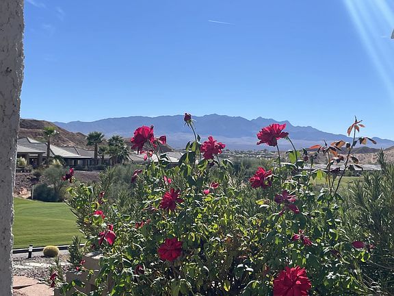 Quaint Golf Course Cottage with Spectacular Mountain Views. Fall in love with this charming cottage located on the fabulous Canyons Golf Course in Mesquite, NV. This home is sited perfectly as it looks over the wide fairway to dramatic SE Mountain Views. Plenty of upgrades both inside and outside. The home's open living space is perfect for entertaining. You will love how the kitchen provides plenty of opportunities for you to interact with your guests. The island has cabinets, with pull outs, for storage; floor to ceiling cabinets serve as the pantry space. This area has room for dining in front of the large slider. The kitchen opens into the living area which has a custom built-in bookcase/entertainment center. This area has lots of natural lights from the windows & slider. The main bedroom has a slider out to a sunken patio which is pre-wired for a hot tub/spa. The en suite has a large soaking tub and dual vanities. For your guests on eminence, the two guest bedrooms and guest bath are located at the front of the home. Plenty not room to relax in the scenic backyard. There is a sunken conversation area & an elevated area which would be perfect for more dramatic views or putting green Get out of the snow! Photos soon.