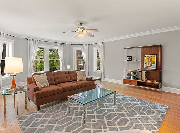 Vintage done right in this beautiful & bright 2 bedroom, 1 bath condo with garage parking in coveted Graceland West! Step into this wonderfully maintained home, featuring hardwood floors thru-out and grand rooms - all in an intimate, 6 unit bldg that's fully owner occupied. Entertaining's a breeze, with the huge, south facing living rm with built-ins, that also enjoys space for a dining table, office area or sitting rm/reading nook. With a massive formal dining rm, you can host a dinner party for 12, 16, or even 20....with a freshly remodeled white kitchen to match! With rooms this large + this much space, you've got flexibility in how you use them. Both bedrooms easily fit king sized beds, and the 2nd BR has adjoining office w/new carpet, and views of the backyard. Tons of storage, on-site laundry + back deck for summer fun, too! Quiet location that's convenient to CTA Brown Line/Bus, Dining/Shopping of Southport, nightlife, Wrigley, and close to the lake, too! Come home!