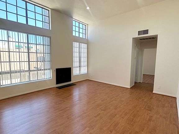 This bright and spacious 1-bedroom, 1-bathroom apartment features soaring vaulted ceilings, large floor-to-ceiling windows that fill the living area with natural light, and warm wood-style flooring throughout. The open living room includes recessed lighting and a cozy fireplace, while the galley kitchen offers generous cabinet space, appliances including a gas stove and dishwasher, and ample counters for meal prep. The comfortable bedroom pairs with an updated bathroom boasting a sleek vanity, contemporary fixtures, and a full tub/shower combo. Additional highlights include central heating and air conditioning, abundant storage, and a convenient location close to shopping, dining, and transportation.