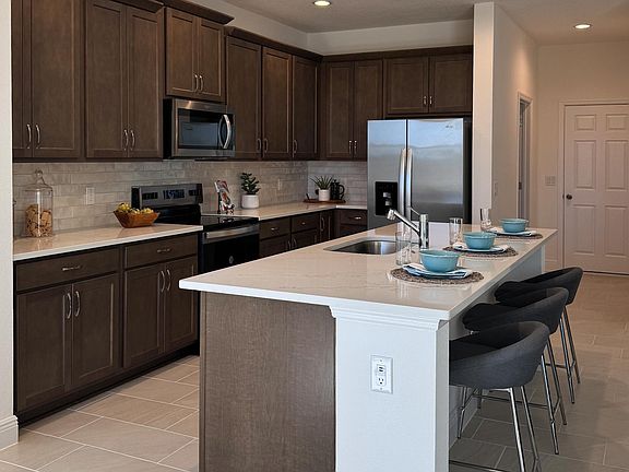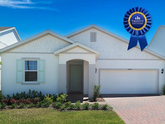 THIS HOME IS MOVE-IN READY!! Introducing the Hayden, an exquisite single-story home plan meticulously crafted by Trinity Family Builders. Boasting four spacious bedrooms and two full baths, this abode is designed for modern comfort and convenience. The heart of the home lies in its expansive kitchen, enhanced with crown molding on upgraded cabinets, a vented microwave, and a kitchen faucet with solid surface countertops, seamlessly flowing into the family and dining room areas, perfect for entertaining guests or cozy family gatherings. The 9'4" ceilings add to the home's grandeur and airy feel. The grandeur continues with the luxurious primary bedroom featuring a walk-in closet and a bath adorned with Trinity's signature Luxury Retreat Shower. Throughout the home, upgraded hardware and upgraded baseboards contribute to its elegant and refined look. Outside, the covered entrance welcomes you home while the covered lanai beckons for al fresco dining and relaxation, completing this perfect blend of elegance and functionality in the Hayden home plan. Additionally, the home includes the exclusive Trinity Package Place built-in outdoor storage area with a secure delivery door and electronic keypad door lock, providing added convenience and peace of mind for homeowners. Furthermore, the Hayden is part of an Energy Star community, ensuring energy efficiency and sustainability. The R-38 insulation upgrade adds to the home's energy-saving features, providing comfort and reducing uti...