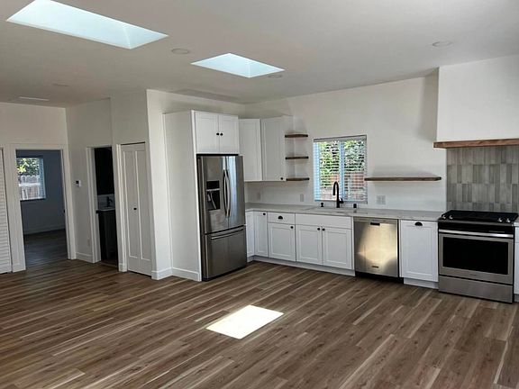 New wood flooring throughout and new appliances. Fully equipped kitchen. Tons of skylights and natural light. Washer, dryer, and refrigerator included.