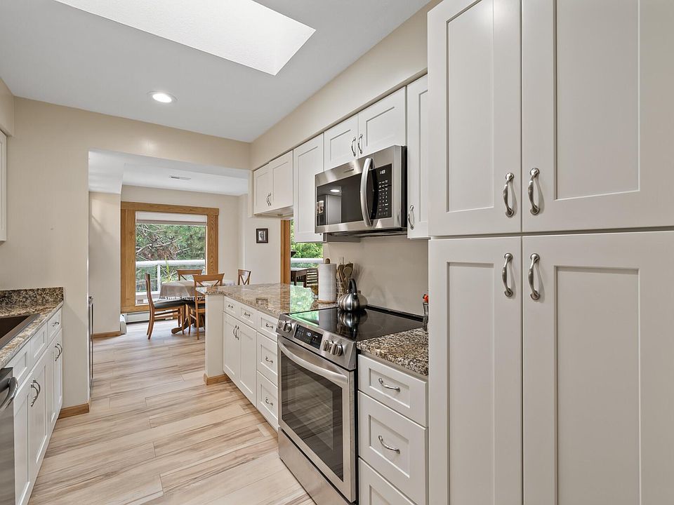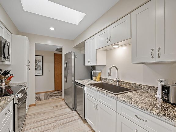 Beautifully condo, fully remodeled in 2024! Fresh flooring, updated lighting, and new paint throughout create a bright and welcoming feel. HOA dues include heat and water—just one of the many perks! Spacious kitchen features new cabinetry, sleek countertops, stainless appliances, and a stylish tile backsplash. The primary bath offers a luxurious walk-in tub, modern vanity, and updated fixtures, while the second bathroom also received a fresh update. Enjoy the convenience of in-unit laundry, a spacious private porch/deck perfect for relaxing or entertaining, and two assigned parking spots with a dedicated storage unit. Move-in ready with a quick close possible!