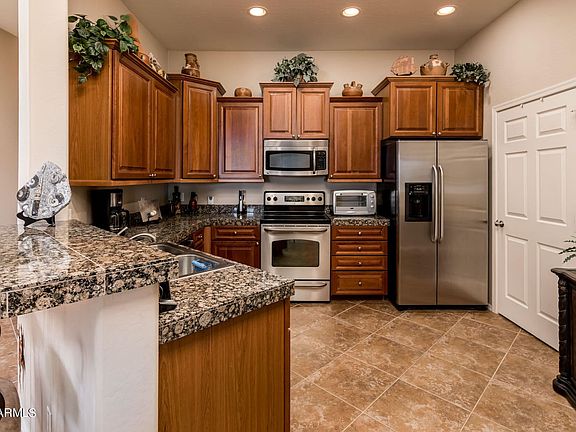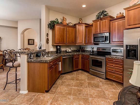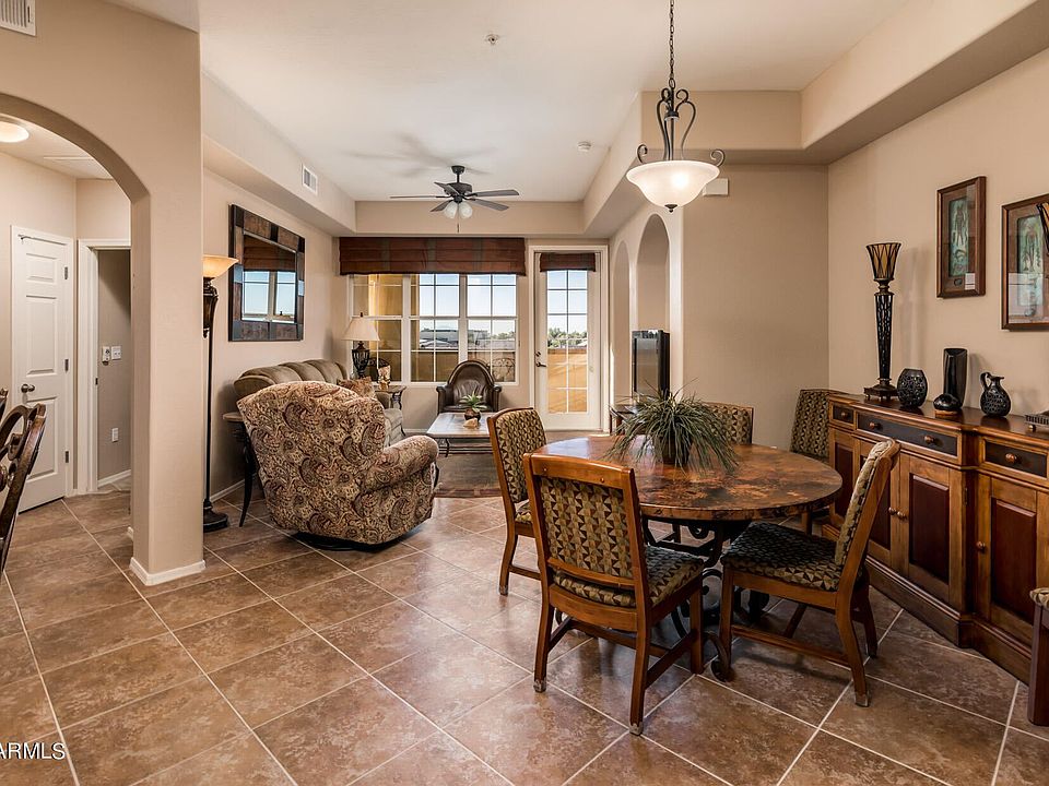 Gorgeous 2 bdrm/2 bath + Den within this gated resort style community that is walking distance to everything; entertainment, shopping, dining, medical etc... You also have access to the pool/spa, clubhouse, business center (with free wifi), fitness center and theatre room. Condo features Numerous Upgrades! Tile Throughout including Custom Tiled Patio, Plenty of Storage with Custom Laundry Shelves and California Closets in both bedrooms, Granite Counters, Upgraded Cabinets, Stainless Appliances, 10 foot Ceilings. Enjoy a view of the White Tank Mountains and Arizona Sunsets from your patio.