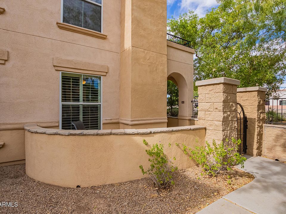 Resort living at its finest! Desirable ground-floor 2-bed, 2-bath condo in the luxurious gated community of Park Place. Enjoy amenities like a heated pool, walking trails, yoga room, fitness center, and clubhouse with a kitchen, theater, and business center. Inside, the open layout features high ceilings, plantation shutters, tile flooring, and a cozy fireplace. The kitchen includes wood shaker cabinets, black appliances, a pantry, and ample counters. The main bedroom has patio access, an ensuite with double sinks, a walk-in closet, and shower grab bar. Covered patio, tandem garage with epoxy floor, and pet-friendly. Close to stadium, shopping, dining, and more. Don't miss this opportunity!