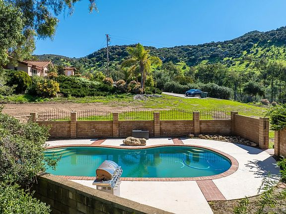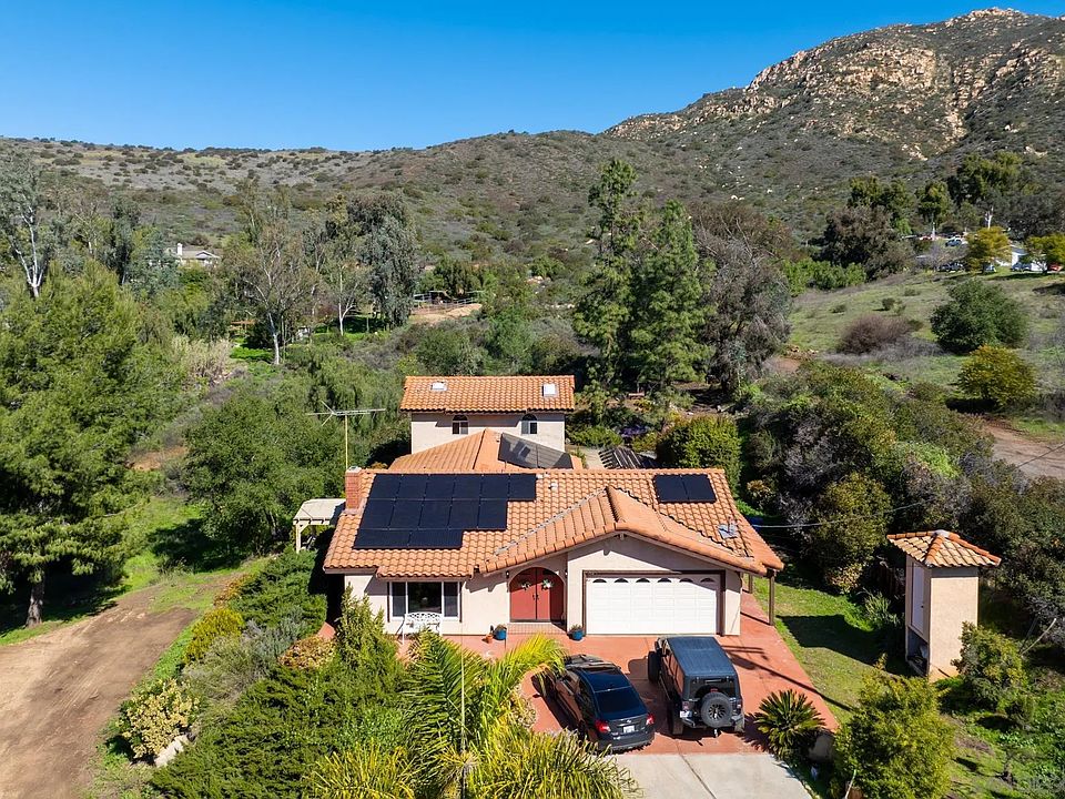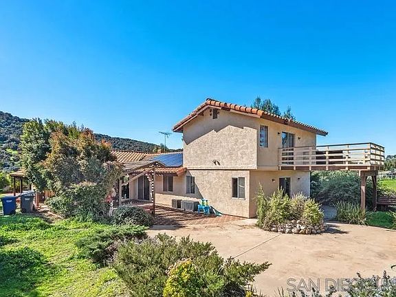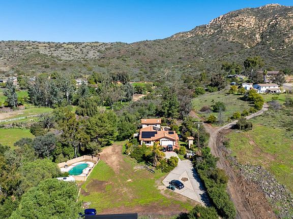 BEST DEAL IN ALL OF 92021! Nestled in the picturesque hills of East County, this custom-built home offers a tranquil oasis with breathtaking views of the surrounding mountains. With a spacious layout spanning over 2400 square feet, this remarkable property offers 4+1 optional bedrooms, 3 bathrooms, and a vast family living area. The home's privacy is enhanced by a secure wrought iron gate at the driveway entry, creating a sense of seclusion and exclusivity. The Primary Suite is a peaceful haven, featuring a downstairs sitting area that can be used as a bedroom, office, or craft space. upstairs includes the ensuite bath, and a private deck, with stunning mountain views. A fully equipped kitchen offers views of the back patio and koi pond, with a breakfast bar and an open design that seamlessly flows into the dining area. The expansive 2.43 acres of usable land surrounding the home. Custom touches throughout operable skylights, fully remodeled baths, new light fixtures, & two 220-volt outlets, suitable for RV hookups. The pool area is an idyllic oasis for fun and relaxation with family and friends and is perfect for entertaining. It has been completely refurbished & has a new pump & filter Multiple sheds provide ample storage space, & various areas offer the opportunity to build an ADU, keep horses or other animals, or pursue any creative landscaping ideas. Surrounded by a nature preserve and avocado groves, this home is sure to delight those looking for something unique with plenty of land. The additional 800esf was added by the same licensed contractor that built the home.