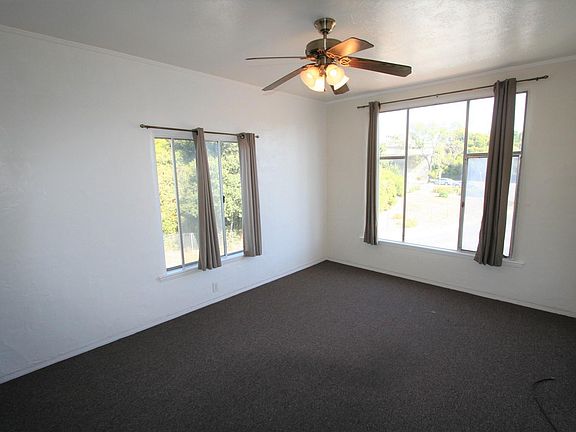 * Ceiling fan, curtains, wood/carpeted floors, range, frig