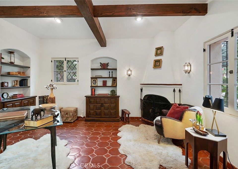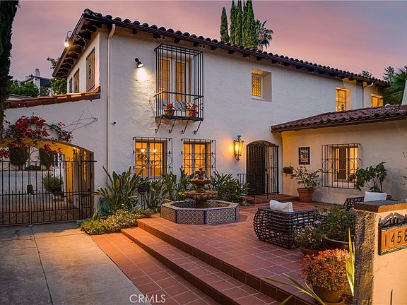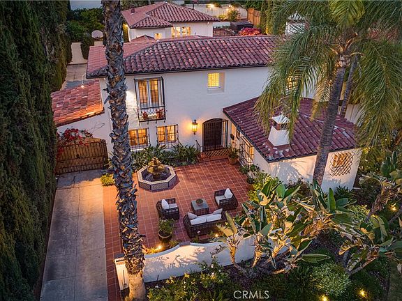 If you’ve always wanted to live in a classic Spanish style pool home, this exceptional property in Glendale’s Royal Canyon Historic District will fulfill your dream. It imparts the feeling of a Mediterranean Villa. Built in 1929, this two-story home has original architectural features including original wood beamed ceilings, hardwood floors, front courtyard with fountain, 4 fireplaces and superb wrought iron grillwork on all the main floor windows. The two-story entry features Terrazzo floors and a sweeping staircase with original tiles. Enter the step down living room to a fireplace and French doors that open to the pool and rear courtyard. This unique home features 4 bedrooms, 6 bathrooms and a cozy den or home office with a fireplace and garden views. Upstairs from the kitchen is a large versatile room with a convenient powder room, tiled fireplace and wet bar for casual dining. Alternately, this space can easily function as a roomy office or studio, a family and/or play room. Access the upper level brick terrace from the wall of French doors. A large 480 sq ft kitchen with breakfast area looks onto the pool area. French doors open to the back patio, gardens and the pool. Next to the kitchen is a spacious dining room full of light from windows that face the front courtyard. An en-suite bedroom is also downstairs next to an exterior entrance. Upstairs, the en-suite primary bedroom offers a luxurious retreat with its tiled fireplace and balcony with views of the pool, gardens and rear patios. The large bathroom has a Jacuzzi tub, dual sinks and over-sized shower. There’s a dream walk-in closet. Two additional bedrooms share a full Jack and Jill bathroom. Enjoy numerous outdoor entertainment areas throughout the grounds. The expansive front courtyard with fountain, the oval pool in a Spanish courtyard and large upper brick patio. The upper terrace has an above ground hot tub. In addition to a two-car garage, the detached structure has a 116 sqft laundry room with a ¾ bathroom that can be used as a changing room for the pool. Additional parking behind the automatic wrought iron gates can accommodate several cars in front of the garage. Close to Nibley Park and GCC. Nearby Glendale Blvd. has popular shopping – Whole Foods, Fish King, Total Wine & more. Minutes to the Americana at Brand, La Canada and Pasadena and just a few miles from DTLA. Glendale has award-winning schools with dual language programs and beautiful parks.
