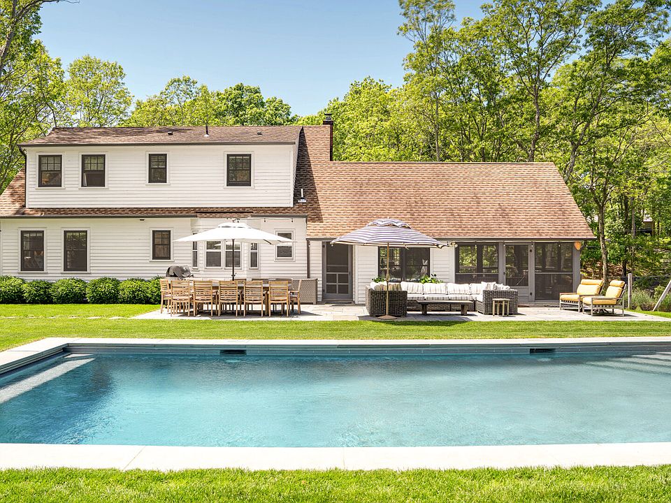Thanks to the first level's open-floor plan, the living room and kitchen share the same space allowing conversation and movement between the two "rooms" to be quite seamless. Right off of the kitchen is a circle dining table with comfortable, deep-seated chairs and a window seat for early morning meals or coffee. Deeper into the home, you'll come across the living room, complete with a sectional, two arm chairs, and decadent art to complete the space. The stairwell leading to the bedrooms contains a fabulous wallpaper to spice up the otherwise plain, white walls. Similarly, the bathrooms and bedrooms upstairs each contain their own pattern combination and color scheme! After waking up to a restful night's sleep, hop into the Sunlighten Sauna for a feel-good detox, and then head downstairs to lounge by the pool with a good book, relax on the back deck, or on rainy days, sit in the screened-in porch with friends/family. There is a grill and plenty of outdoor furniture (including a table that seats 10!) for you to prepare a quintessential Summer BBQ as the sun begins to set. If, however, you prefer to eat indoors, there is a larger round dining room table compared to the one mentioned previously that comfortably sits eight people. Downtown Sag Harbor is only a few minutes away via car and contains incredible restaurants if you'd like a break from cooking. Spend the evening strolling down the streets, shopping, dining, and maybe stopping for ice cream afterwards! Being close proximity to town, lounging by a private pool, and having all other amenities that come with the home, it's no wonder why Sagg Road Cottage is the perfect Summer getaway destination!This property has a max occupancy of 8Please note: Additional date ranges available upon inquiry