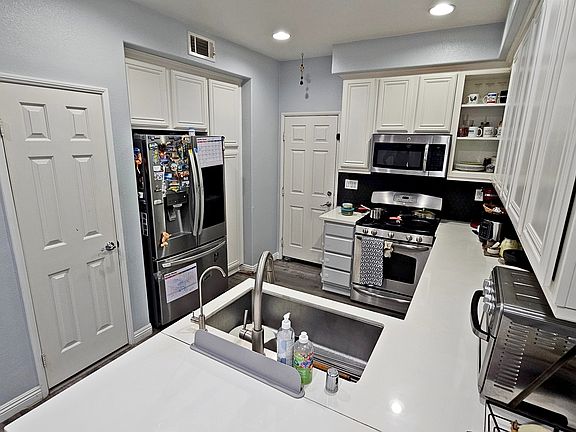 The newly remodeled kitchen stands out with sleek countertops, stainless steel appliances, a large pantry and updated cabinetry all just steps away from the dining space and direct garage entry.